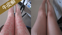 41岁的刘女士来我院治疗牛皮癣时,已有四年的病史。刘女士介绍,四年前,右上臂因被玻璃划破,造成感染,后伤口痊愈,但伤口 处经常瘙痒发红,半月之后伤口周围出现红斑,红斑处干燥,逐步形成银白色皮屑,周围翘起,中部与皮肤相连,皮屑层层脱落,并慢慢向四周扩展,皮肤变硬,瘙 痒难忍。病发一月后,去当地医院治疗,诊断为牛皮癣,用西药治疗,但毫无效果。癣块扩散到整个背部。